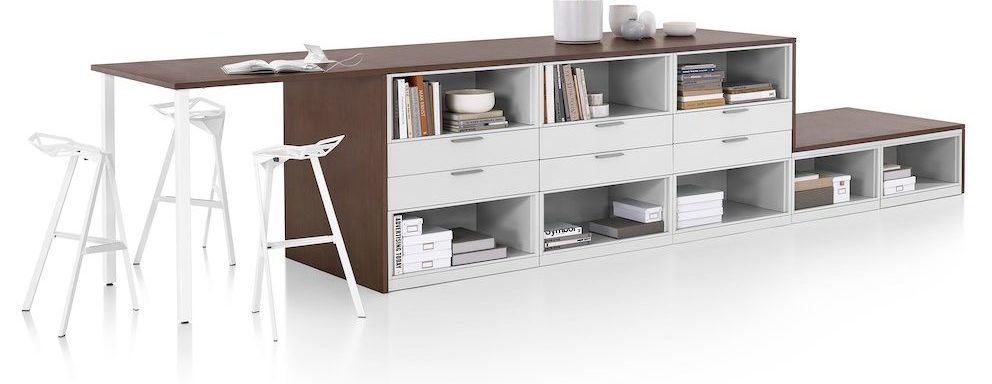 Meridian offers a suite of storage solutions that can be used to create workspaces where people have a more natural experience of work and interaction. The design efficiently stores personal and work items, creates boundaries, and provides places for people to gather, while also serving, when desired, as an attractive focal point for a space.
